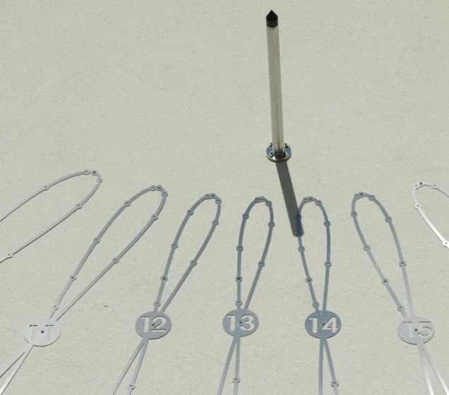 7. Choix des matériaux et esthétique Partant du principe que la réalisation actuelle d’un cadran solaire doit faire appel aux techniques les plus récentes, au même titre que la manière de calculer et de tracer l’épure, j’ai cherché, pour lui donner corps, des matériaux et un design d’aujourd’hui. Je le voulais également plus proche de l’instrument scientifique que de l’œuvre décorative. Il me fallait des matériaux nobles, résistant aux intempéries et d’utilisation aisée. J’ai donc choisi l’inox.